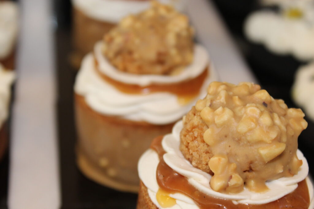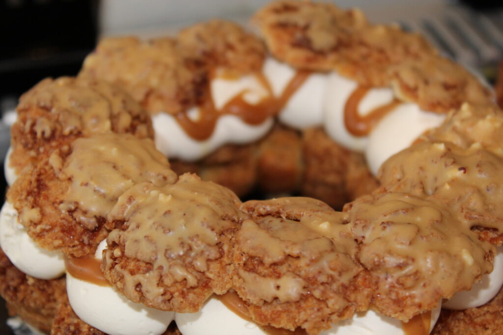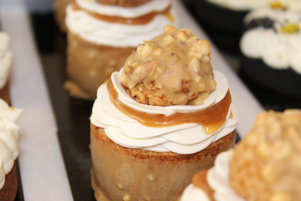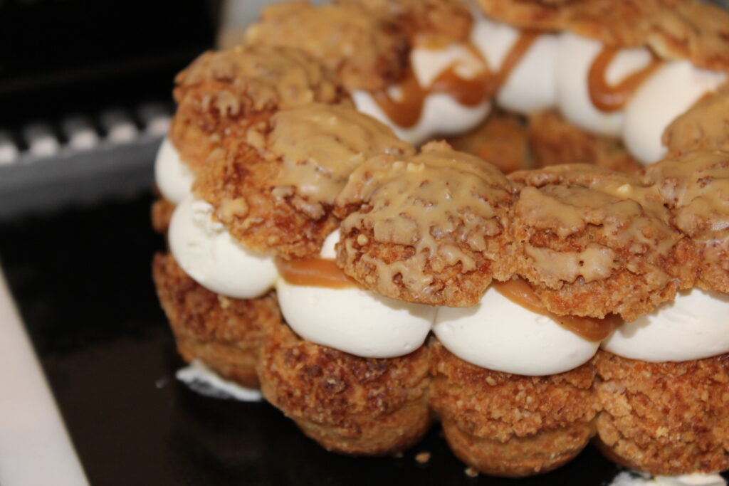 Retrouvez la gourmandise d’un caramel macchiato en version pâtisserie. Ce chou enrobé d’un glaçage au chocolat dulcey et à la noisette est composé d’un croustillant noisette, d’un crémeux café dans lequel est niché un cœur coulant de caramel beurre salé à la vanille, d’une chantilly café surmonté d’un petit chou garni de crémeux café.