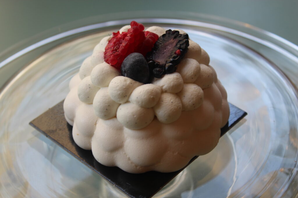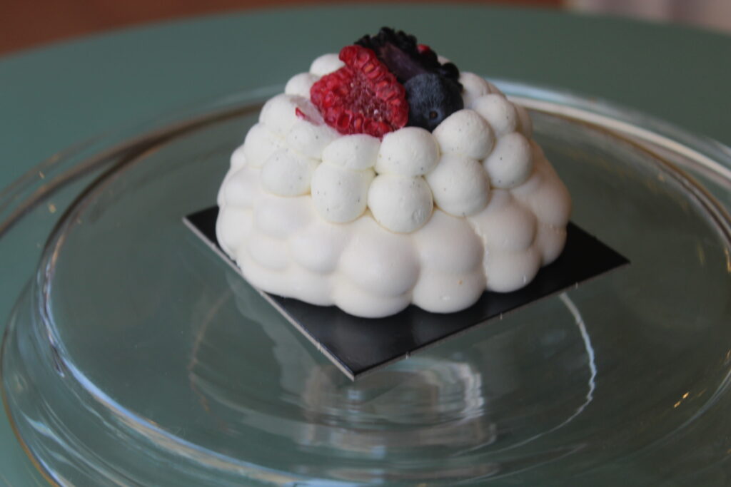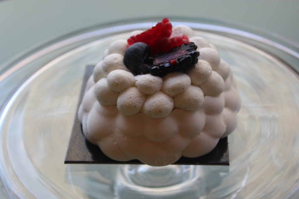 Cette pavlova est constituée d’une délicate meringue française parfumée au yuzu, d’un confit de myrtilles et d’une chantilly vanille. Des fruits rouges frais ornent le centre pour une gourmandise assurée.